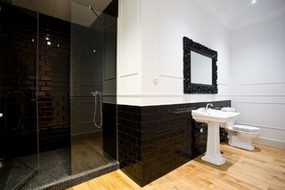 D'ailleurs, dans certains intérieurs, le bois n'est pas présent sur un la salle de bain en noir et blanc de style luxueux accueillerait volontiers des accessoires métalliques, comme nous le montre cet intérieur inspiré du.